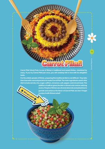 1Carrot Pilaf (Havij Polo) is one of Shiraz%u2019s traditional and sweet dishes, cherished by many. If you try Carrot Pilaf just once, you will certainly fall in love with its delightful taste. For the artistic people of Shiraz, preparing this traditional dish is not difficult. They take their time with care and precision to make Carrot Pilaf. The main ingredients used in this dish include carrots, rice, sugar, saffron, cinnamon, salt, pepper, and minced meat. The addition of saffron gives the dish a vibrant color and an enticing aroma. People of Shiraz use slivered almonds and pistachios to garnish and enhance the flavor of Carrot Pilaf, but don%u2019t forget to enjoy it with Shirazi salad! Shirazi salad