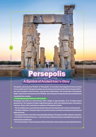 Persepolis, also known as *Parseh* or *Persepolis*, is one of the most magnificent historical sites in Iran and the world. This grand complex served as the ceremonial capital of the Achaemenid Empire and is located in Fars Province, near the city of Marvdasht. The construction of Persepolis began under Darius the Great around 518 BCE, and subsequent kings like Xerxes and Artaxerxes I expanded the complex. %u2022 The Breathtaking Architecture of Persepolis: Persepolis was built on a stone terrace with a height of approximately 12 to 18 meters above ground level. The complex includes magnificent palaces, halls, stunning staircases, and massive columns. Some of the most famous sections of Persepolis include: - The Grand Stairway: A symmetrical double staircase forming the main entrance to Persepolis. - The Gate of Nations: The place where envoys from various countries would present themselves before the king. - The Apadana Palace: One of the most splendid buildings in Persepolis, built for official ceremonies. - The Hall of a Hundred Columns: A vast hall whose towering columns exemplify the grandeur of Achaemenid architecture. - The Tachara Palace: The private palace of Darius the Great, whose walls are made of polished stone.