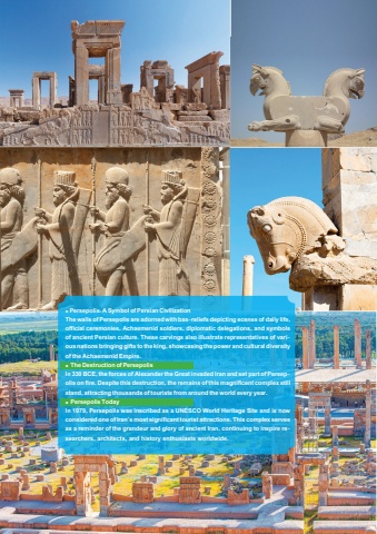 1%u2022 Persepolis: A Symbol of Persian Civilization The walls of Persepolis are adorned with bas-reliefs depicting scenes of daily life, official ceremonies, Achaemenid soldiers, diplomatic delegations, and symbols of ancient Persian culture. These carvings also illustrate representatives of various nations bringing gifts to the king, showcasing the power and cultural diversity of the Achaemenid Empire. %u2022 The Destruction of Persepolis In 330 BCE, the forces of Alexander the Great invaded Iran and set part of Persepolis on fire. Despite this destruction, the remains of this magnificent complex still stand, attracting thousands of tourists from around the world every year. %u2022 Persepolis Today In 1979, Persepolis was inscribed as a UNESCO World Heritage Site and is now considered one of Iran%u2019s most significant tourist attractions. This complex serves as a reminder of the grandeur and glory of ancient Iran, continuing to inspire researchers, architects, and history enthusiasts worldwide.
