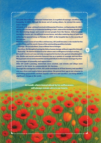1Ali Landi, the selfless and heroic Iranian teen, is a symbol of courage, sacrifice, and humanity. In 2021, through his brave act of saving others, he etched his name in Iran%u2019s history. Ali Landi, a 15-year-old boy from Izeh in Khuzestan Province, on September 24, 2021, during a fire incident in a residential building in Izeh, entered the building despite the life-threatening danger and saved several people from the flames. Unfortunately, during this heroic act, he suffered severe burns, and after enduring days of pain and suffering, he passed away on October 3, 2021, in the hospital due to the severity of his injuries. With his unique sense of sacrifice and bravery, Ali Landi became a role model for the youth of Iran and the world. Some of his outstanding qualities include: - Courage : He saved others%u2019 lives without fear of danger. - Sacrifice : He thought of saving his fellow human beings without regard for himself. - Humanity : He demonstrated love for others and a willingness to help in action. Ali Landi%u2019s heroic act was not only recognized in Iran but also gained attention globally. Media and social networks honored him as a symbol of courage and sacrifice. Many people in Iran and around the world paid tribute to this heroic teenager by sharing messages of sympathy and appreciation. After Ali Landi%u2019s passing, memorials were created, and streets and alleys were named in his honor to commemorate his heroism. Through his courageous action, Ali Landi reminded us all that bravery and sacrifice can save lives and inspire future generations. He proved that age is not a barrier to performing great deeds and that anyone, with love and sacrifice, can bring about a significant change in the world. Ali Landi, a hero immortalized by his selflessness, will always remain alive in our hearts.