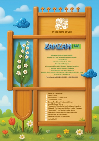 Managing Director: Mahdi Fayyazi %u2022 Editor-in-Chief: Seyed Mohammad Zolfaqari %u2022 Editorial Board Fatemeh Sadat Sebt-al-Nabi Zahra Sadat Zolfaqari %u2022 Internal and Executive Manager: Maryam Hamzelou %u2022 Designer and Art Director: Efat Bahar %u2022 In collaboration with: Beynat Institute Address: Iran, Tehran, Valiasr Street, Fatemi Intersection, No. 1938 Postal Code: 1415894857 Phone Numbers:00982188934302 -00982188934303 Table of Contents: Editor%u2019s Note Saadi Shirazi, A Global Poet Lessons from Saadi Shiraz, The City of Poetry and History Local Dishes of Shiraz Persepolis, A Symbol of Ancient Iran%u2019s Grandeur Ali Landi, The Brave and Selfless Iranian Teenager %u201cHopscotch%u201d A Popular Iranian Game Zurkhaneh Rituals, Iran%u2019s Cultural Heritage Puryaye Vali, A Lasting Hero Iranian Animation: %u201cPahlevanan%u201d Iran%u2019s Wildlife 34681012141618202122In the name of God