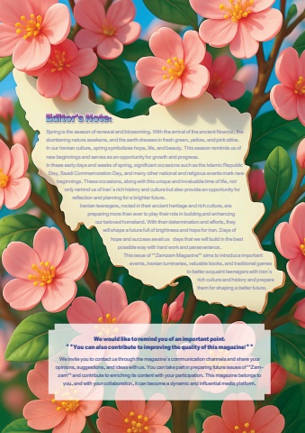 1Spring is the season of renewal and blossoming. With the arrival of the ancient Nowruz, the slumbering nature awakens, and the earth dresses in fresh green, yellow, and pink attire. In our Iranian culture, spring symbolizes hope, life, and beauty. This season reminds us of new beginnings and serves as an opportunity for growth and progress. In these early days and weeks of spring, significant occasions such as the Islamic Republic Day, Saadi Commemoration Day, and many other national and religious events mark new beginnings. These occasions, along with this unique and invaluable time of life, not only remind us of Iran%u2019s rich history and culture but also provide an opportunity for reflection and planning for a brighter future. Iranian teenagers, rooted in their ancient heritage and rich culture, are preparing more than ever to play their role in building and enhancing our beloved homeland. With their determination and efforts, they will shape a future full of brightness and hope for Iran. Days of hope and success await usdays that we will build in the best possible way with hard work and perseverance. This issue of **Zamzam Magazine** aims to introduce important events, Iranian luminaries, valuable books, and traditional games to better acquaint teenagers with Iran%u2019s rich culture and history and prepare them for shaping a better future. We would like to remind you of an important point: **You can also contribute to improving the quality of this magazine!** We invite you to contact us through the magazine%u2019s communication channels and share your opinions, suggestions, and ideas with us. You can take part in preparing future issues of **Zamzam** and contribute to enriching its content with your participation. This magazine belongs to you, and with your collaboration, it can become a dynamic and influential media platform.