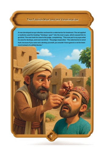 17The Foolish Man and the VeterinarianA man developed an eye infection and went to a veterinarian for treatment. The vet applied a medicine used for treating **donkeys%u2019 eyes** into the man%u2019s eyes, which caused him to go blind. The man took his case to the judge, complaining, %u201cThis man put in my eyes what he uses for donkeys, and now I am blind.%u201d The judge responded, %u201cThe veterinarian is not at fault, because if you were not a donkey yourself, you wouldn%u2019t have gone to a vet for treatment instead of a skilled doctor.%u201d
